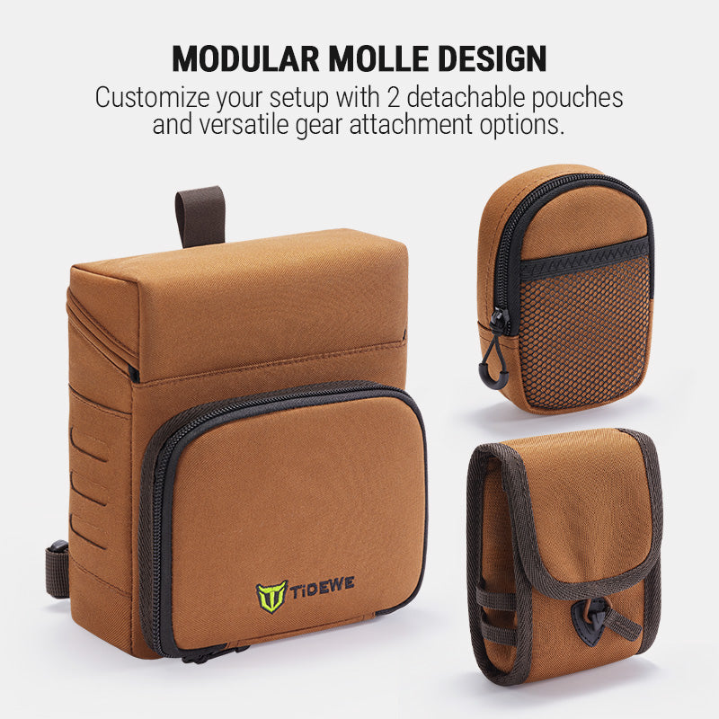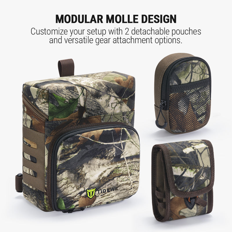 Modular MOLLE Storage: 6 storage zones with 2 detachable MOLLE pouches (zippered & rangefinder). Swap pouch positions for left- or right-hand access. Fully modular for custom setups