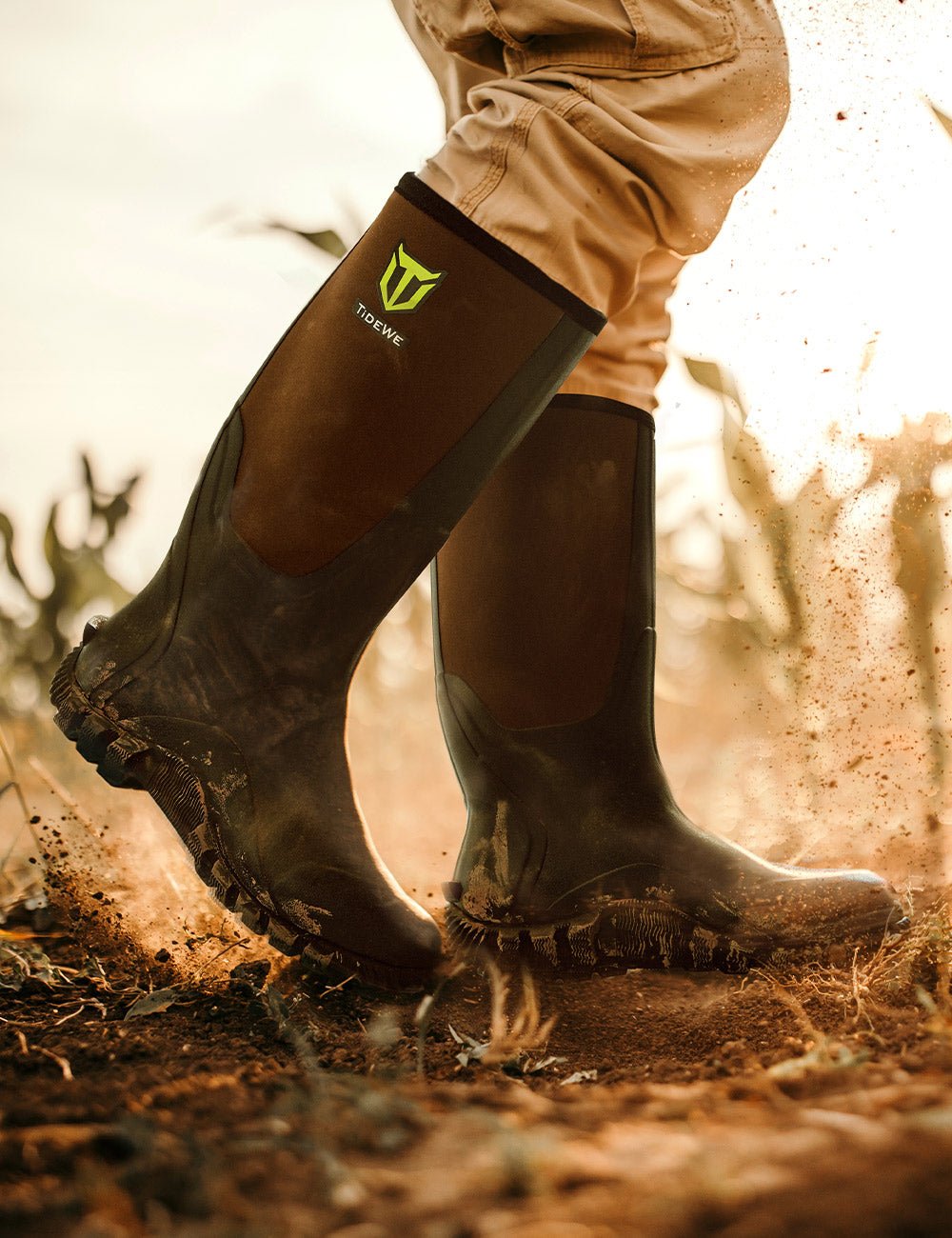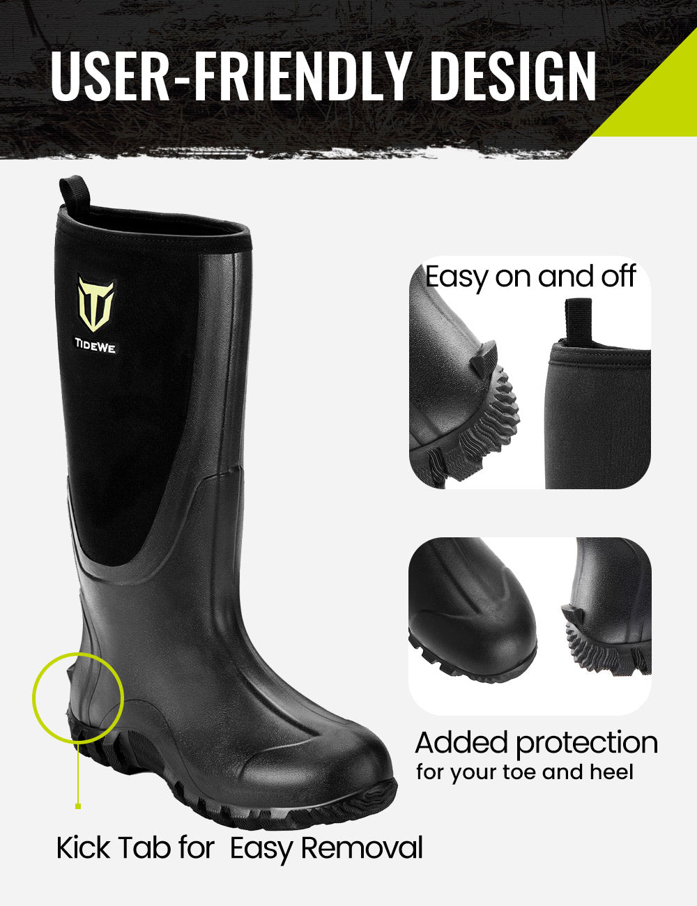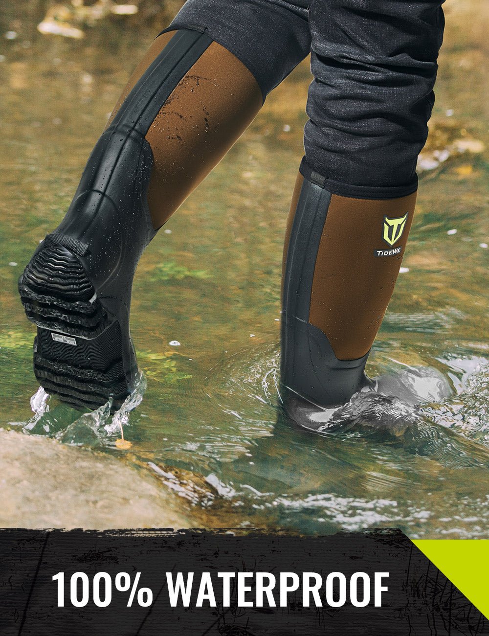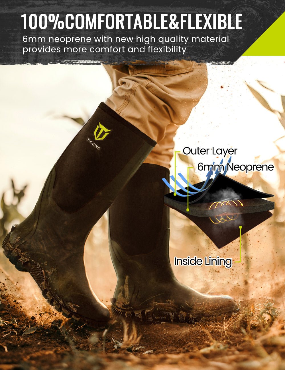 Waterproof & Anti-Slip: TideWe men rubber boots feature 6 mm Neoprene Uppers and natural rubber material, which make the boots 100% waterproof and extra tough. Rubber non-slip soles with deep tread provides traction over varied terrain.