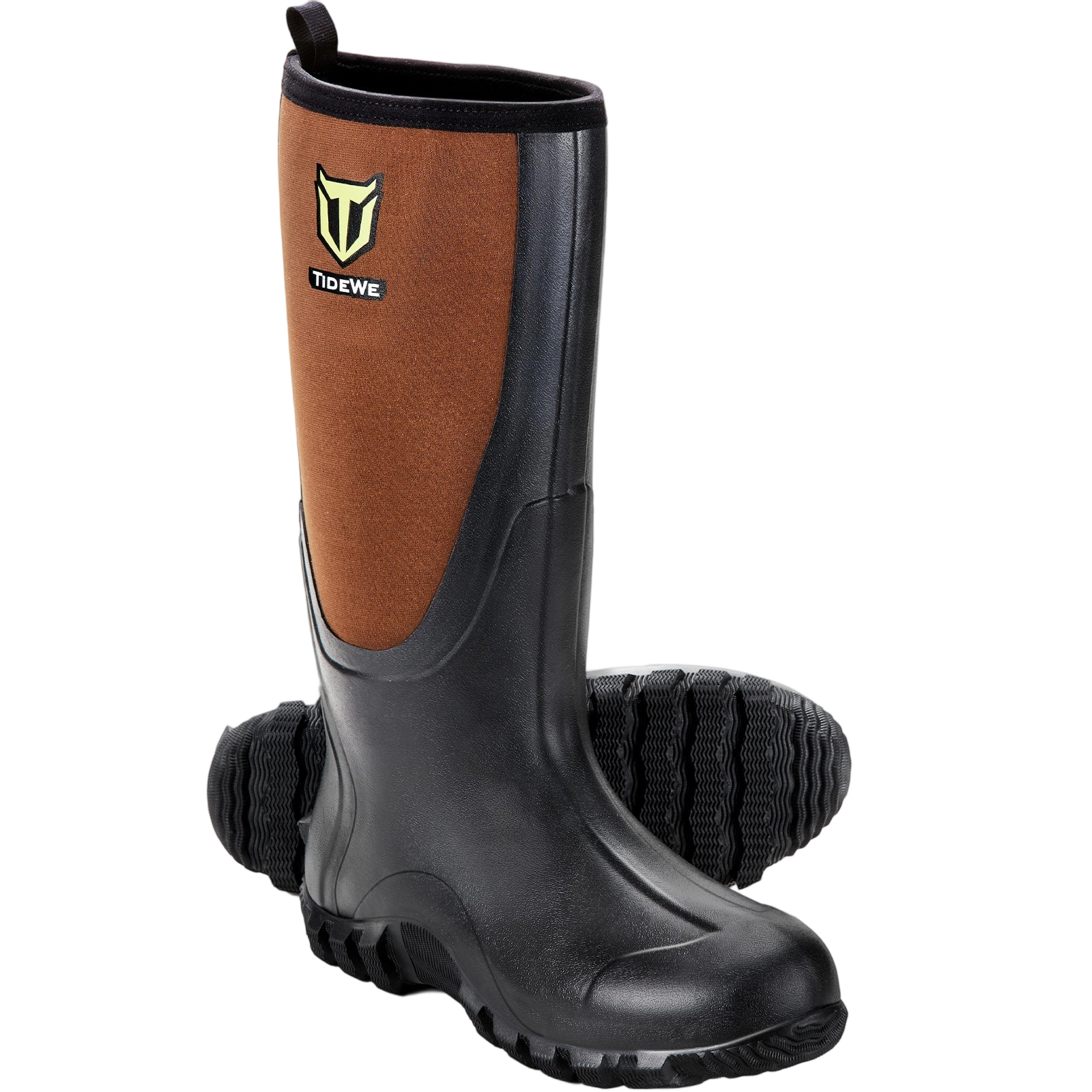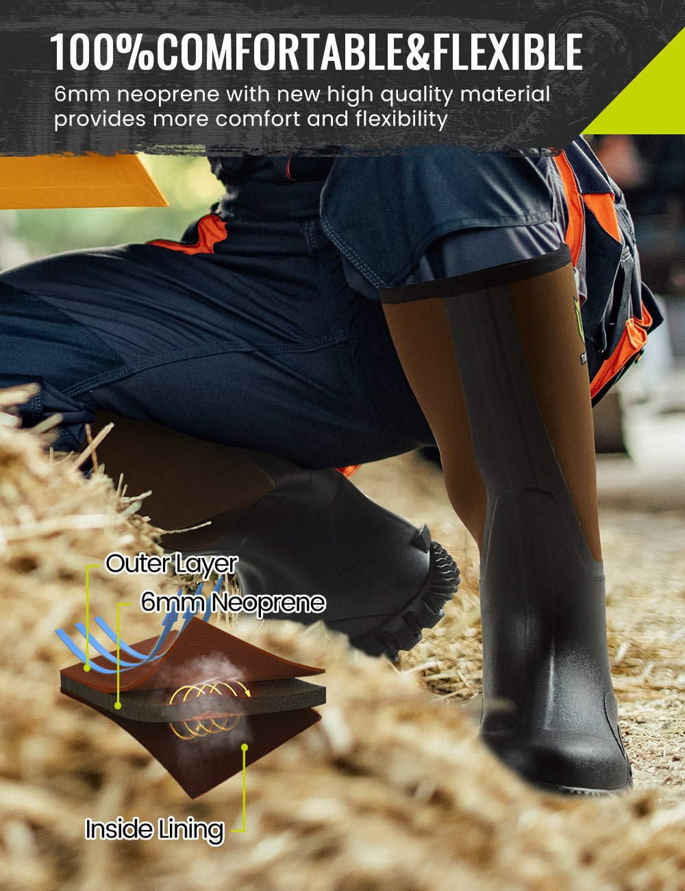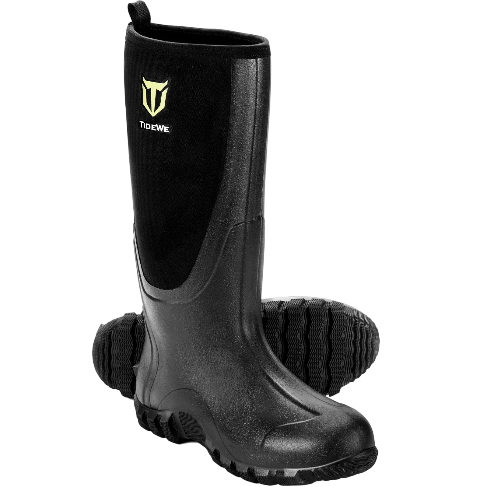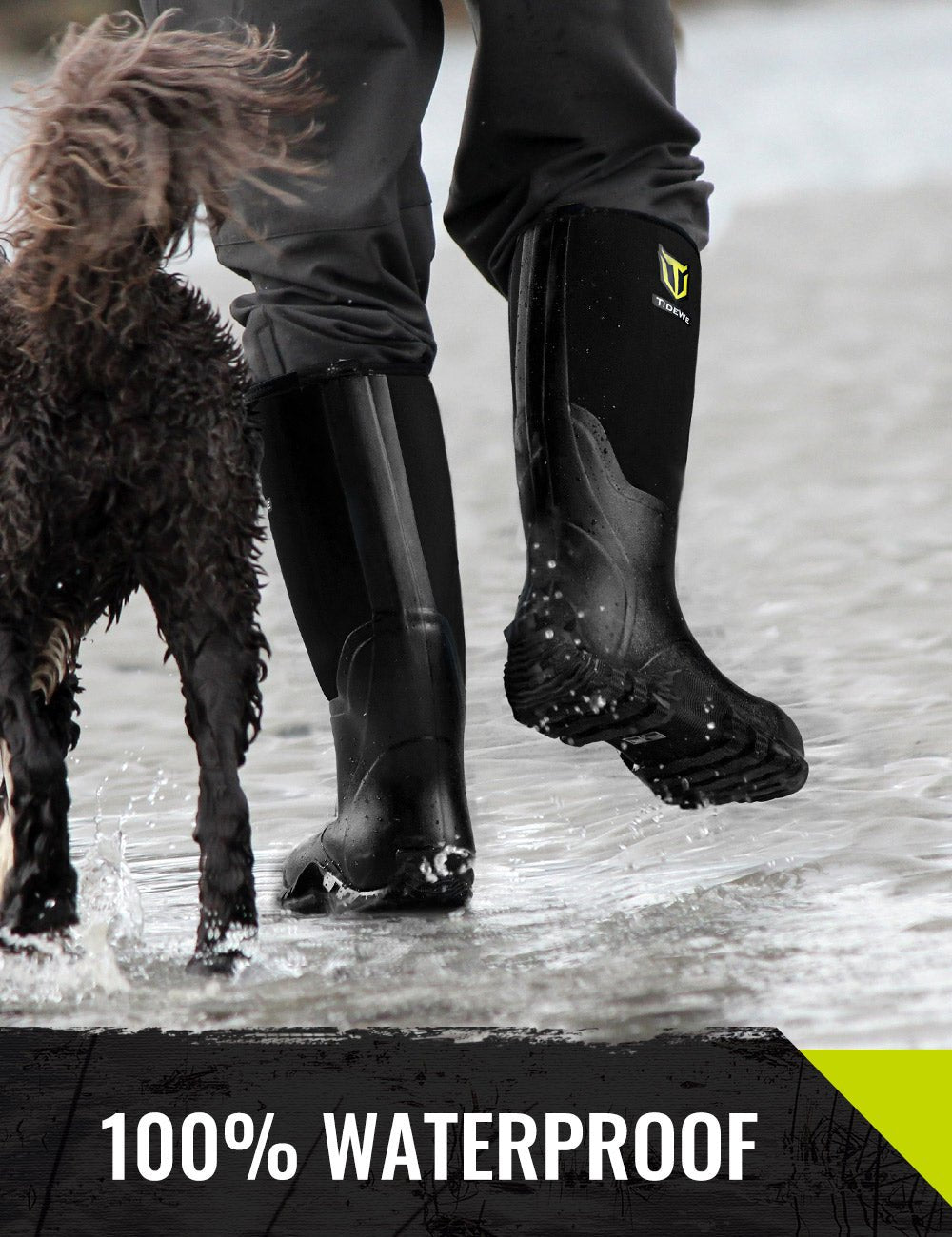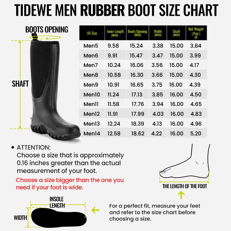 Waterproof & Anti-Slip: TideWe men rubber boots feature 6 mm Neoprene Uppers and natural rubber material, which make the boots 100% waterproof and extra tough. Rubber non-slip soles with deep tread provides traction over varied terrain.