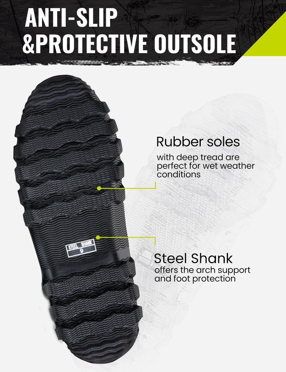 Durable & User-Friendly: To provide more support and protect, using a steel shank make the rubber boots more durable, supportive and adds extra layer of foot protection. Reinforced rubber shell offers more protection on our toe and heel. With Pull-on tab and kick, you can get take easily on and off the boots.