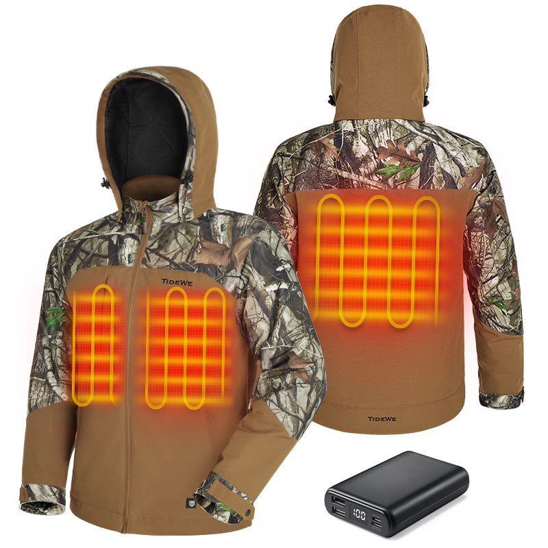Heated Jacket for Men | Waterproof Heated Softshell Hunting Coat with 5V Battery Pack & Detachable Hood | Plus Size Heated Camo & Fishing Jackets