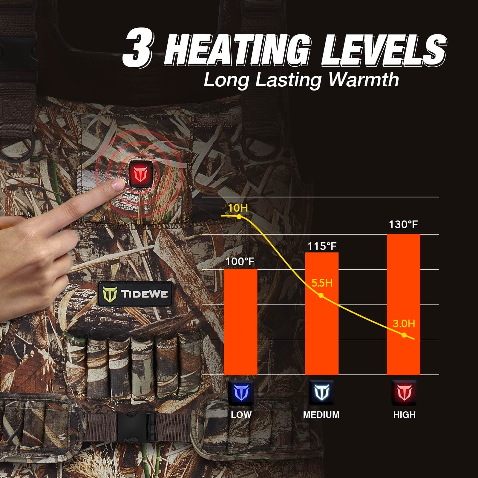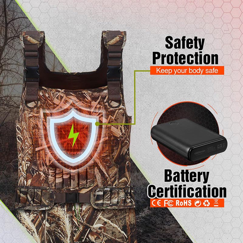 Smart Heating Design & Safety: TIDEWE heated waders feature 3 adjustable heat settings, which makes it easy for you to adjust the temperature according to your needs, delivering comfort in cold conditions. Waders can be fully charged in 3-4 hours; quick charge is only 2 hours. Up to 10 working hours on the lowest setting, 6 working hours on medium, 4 hours on high. Satety protection keeping you warm and safe at the same time.(battery not include)