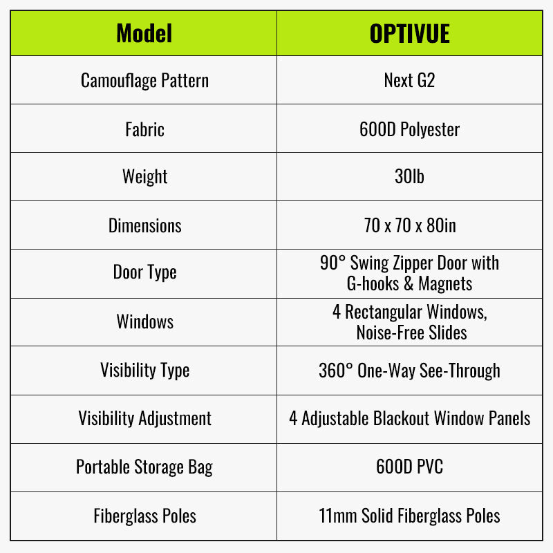 Convenient and Spacious Design: The OptiVue offers ultimate convenience with a 90° swing door for quick access and easy gear loading. Its pop-up design allows for fast setup and takedown, while the 600D PVC storage bag ensures extra protection and easy transport. Plus, it comfortably fits 3-4 people, making it ideal for group hunts.
