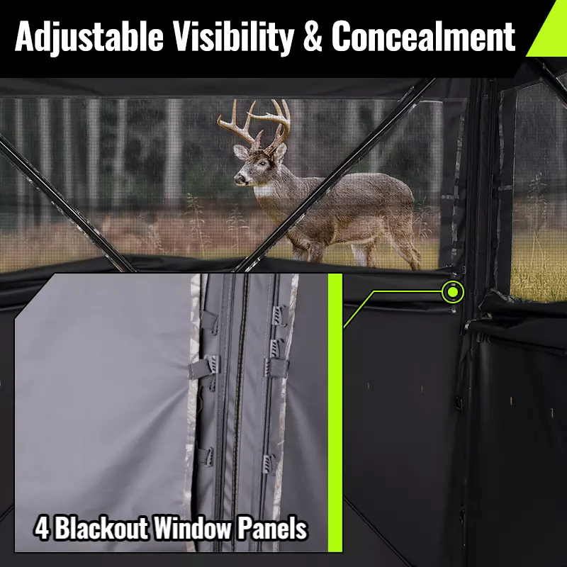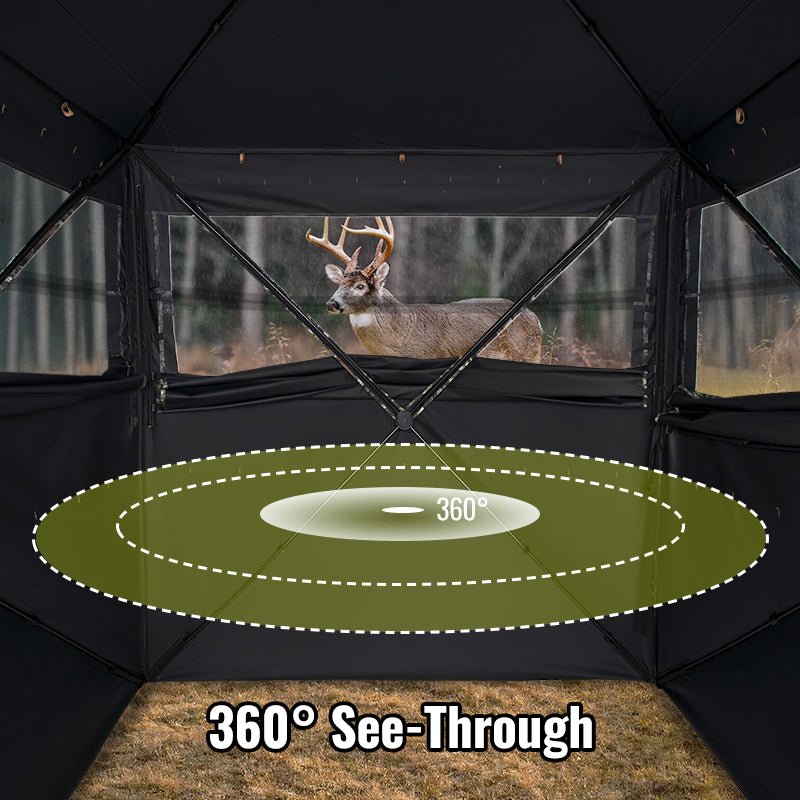 Experience the next level of hunting with this cutting-edge blind, offering a 360° clear view and ultimate concealment. Featuring durable 600D fabric, woven one-way see-through mesh, and a 90° full-access door, it ensures you're always prepared for the perfect moment.
