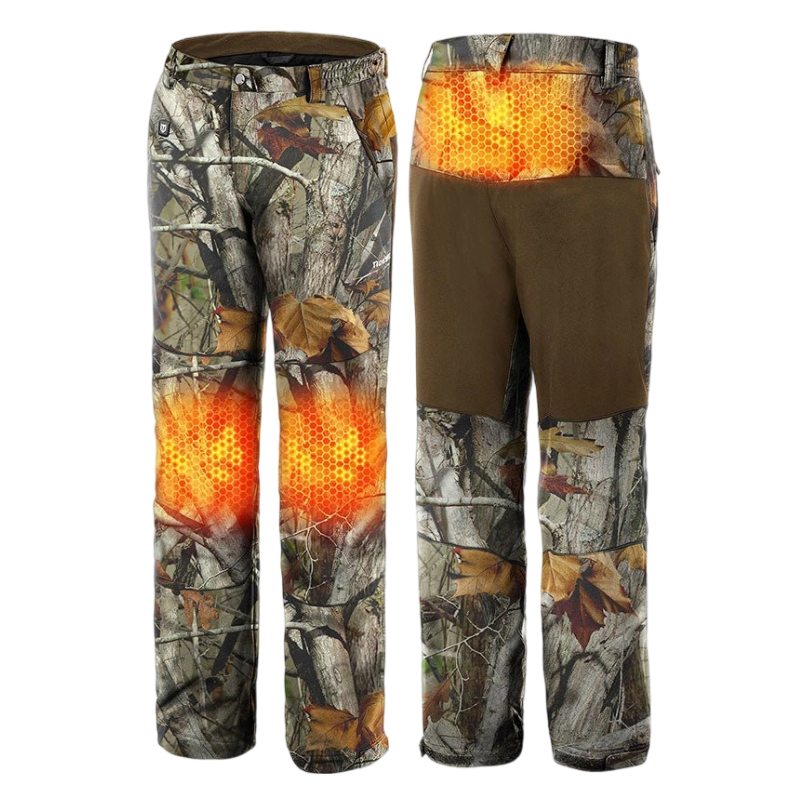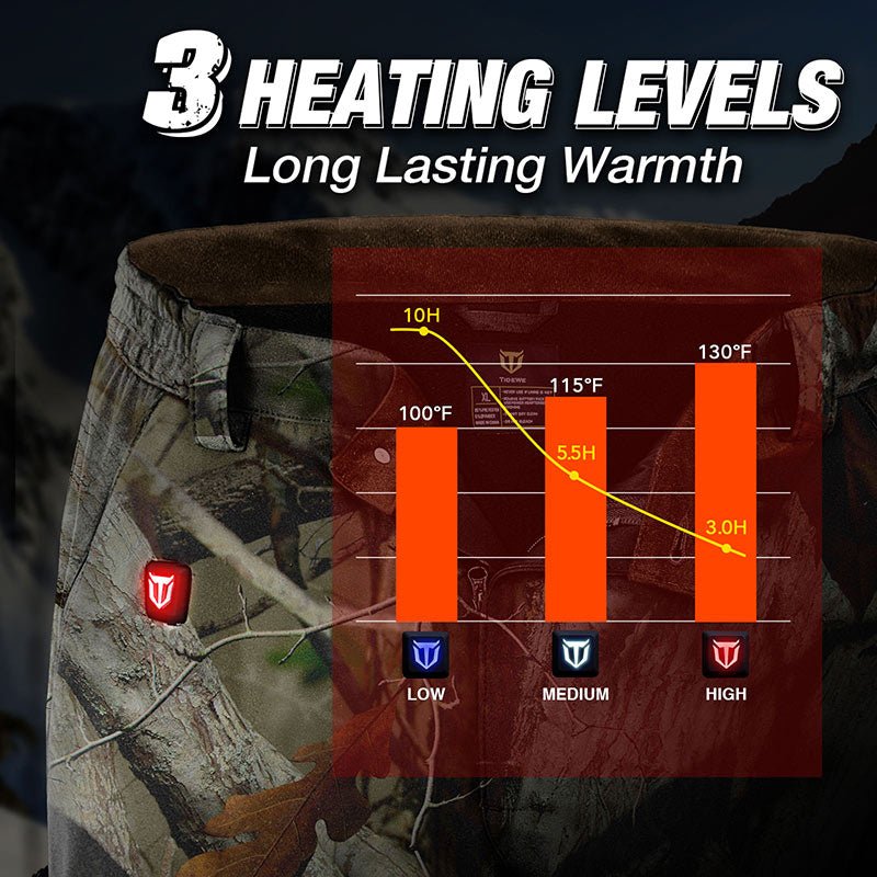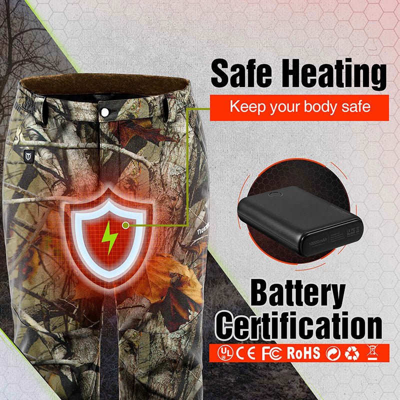 Water-resistant & Safe: Water-resistant finish on the exterior fabric of our hunting heated pants helps drive water away and keeps you dry in light rain or snow. The fleece-padded design keeps you warm at the same time. The included TIDEWE battery has a UL, FCC, RoHS, CE certification. Once the temperature is beyond 130 ℉, the battery will turn off, keeping you safe.