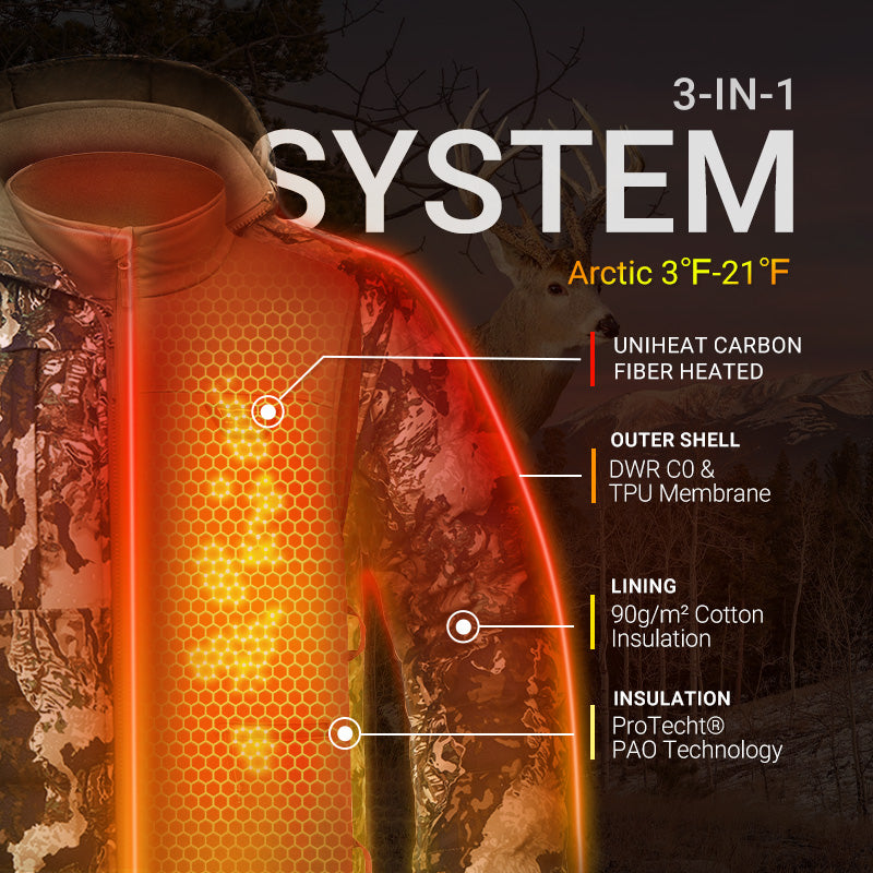 This 3-in-1 heated hunting jacket is engineered for North American whitetail deer hunters who demand uncompromising performance and long hours of stillness in arctic cold (Arctic 3℉-21℉/-16°C to -6°C).