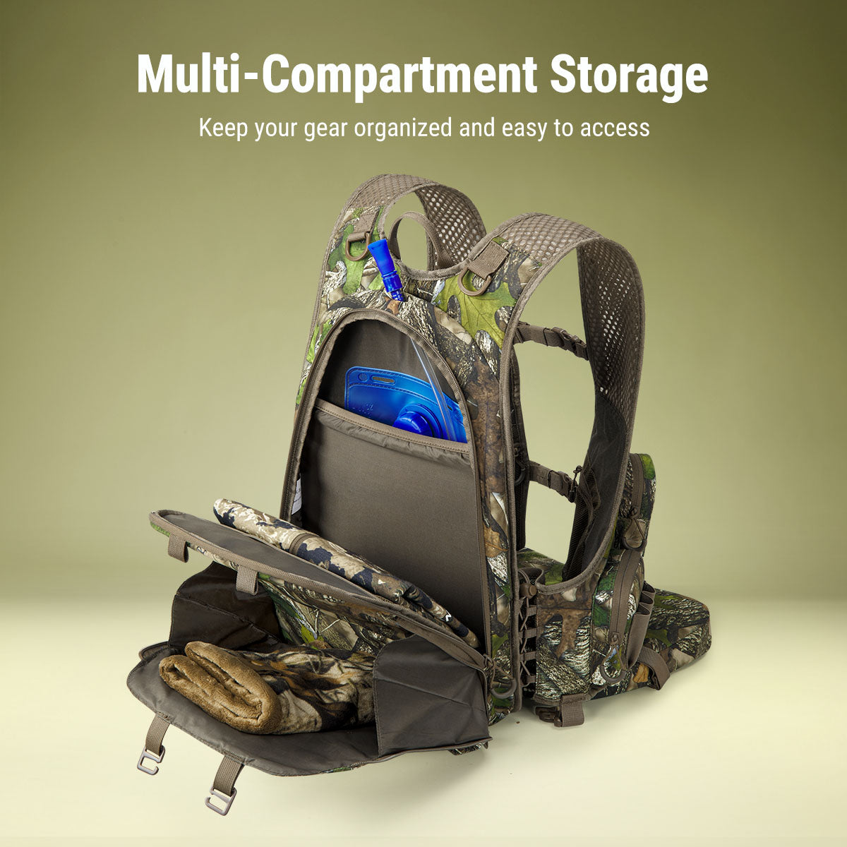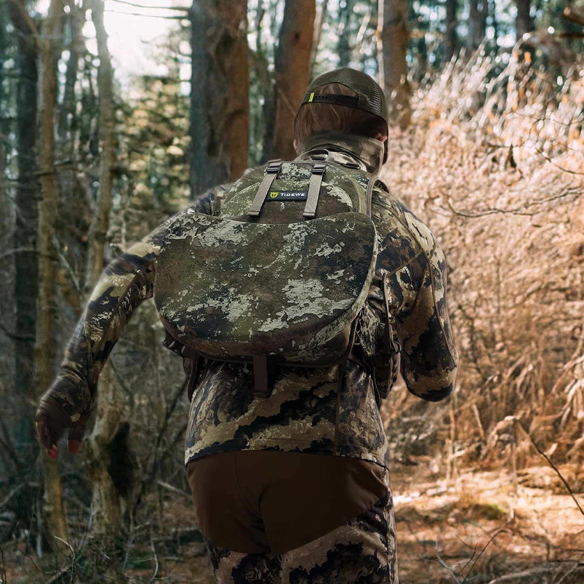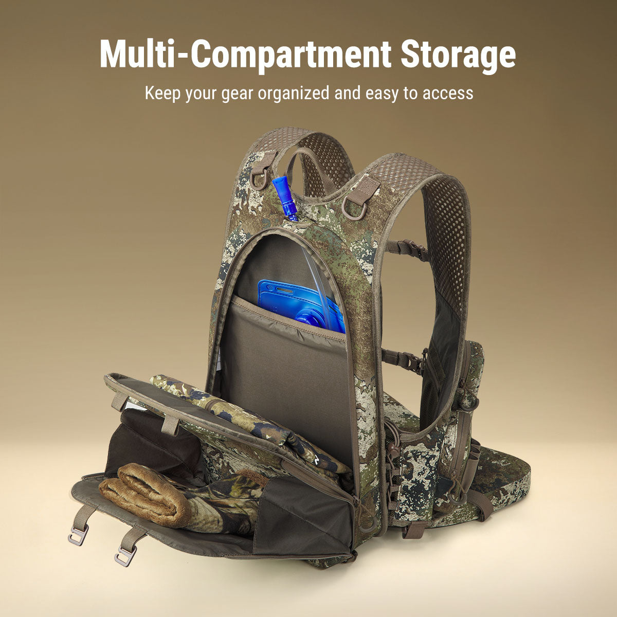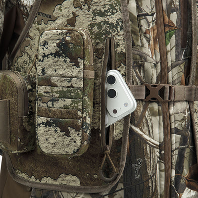 The adjustable chest strap keeps the pack stable during the hunt.