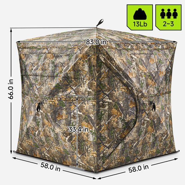 Adequate Space: Dimensions: 65” height, hub to hub 75" x 75", and with a floor space of 58" x 58". TIDEWE hunting blinds can comfortably accommodate two or three hunters.