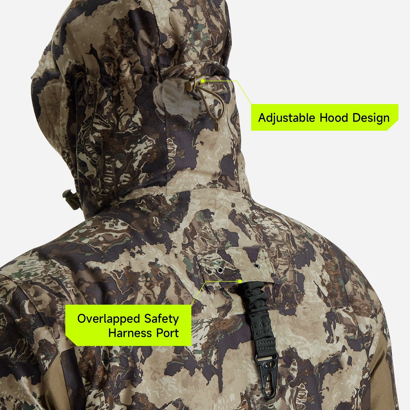 Purpose-driven Features: There are many functional details in the hunting suit, including fleece-lined hand warming pockets and a magnetic closure chest pocket to reduce noise, adjustable wrist cuffs and hems to maintain warm, the adjustable hood for the field of view, an overlapping safety harness ports that are essential for the tree stand.
