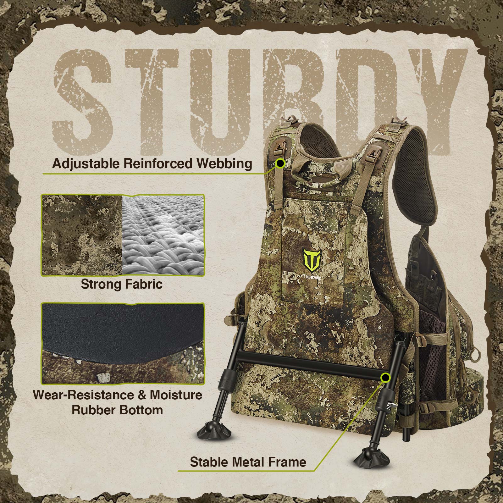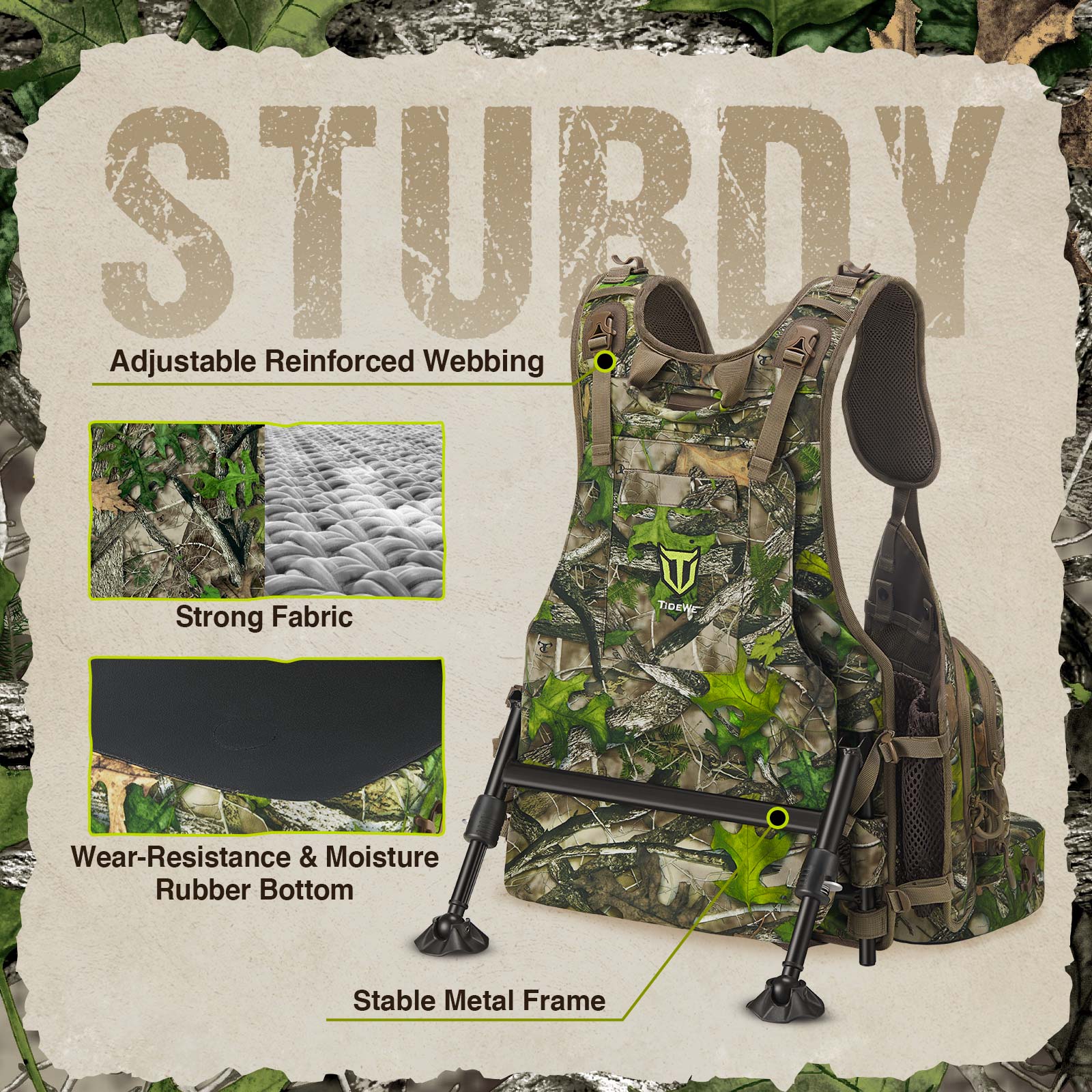Comfortable & Ergonomic Design: TideWe turkey vests are equipped with removable and adjustable frames paired with a 3-inch cushioned seat. This allows you to sit comfortably anywhere in the woods or fields. The padded back with a breathable mesh and ergonomic design offers a perfect hunting experience.