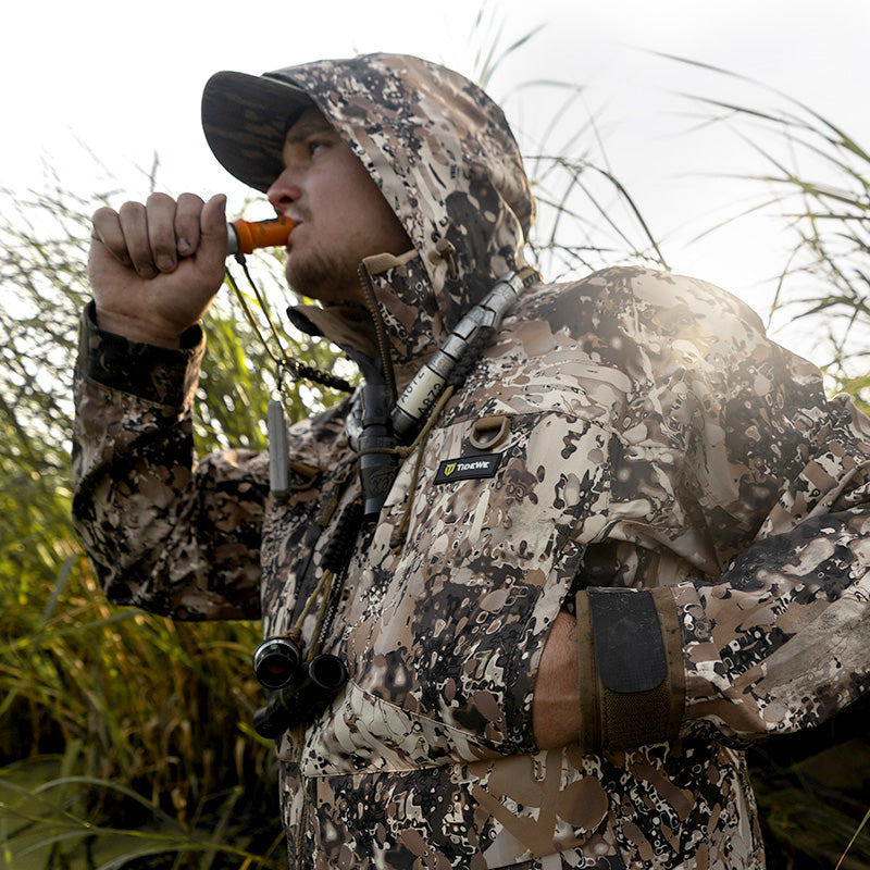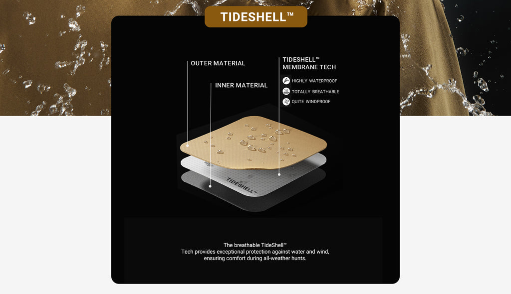 Waterproof Breathable TideShell™ Tech: Featuring the breathable TideShell™ Tech and an eco-friendly waterproof DWR C0 coating, the hunting jacket fabric provides exceptional protection against water and wind, ensuring comfort during all-weather hunts.