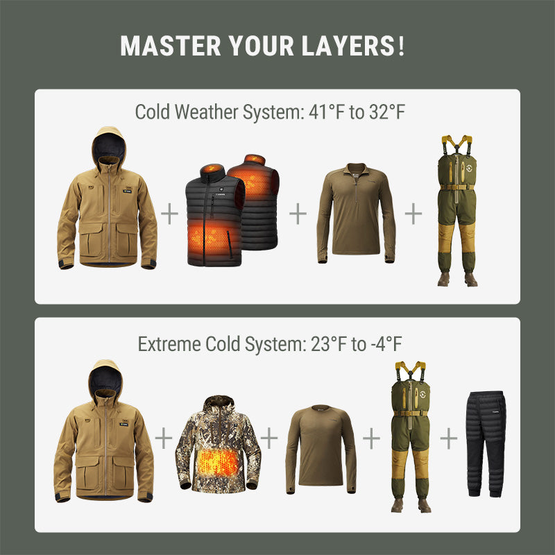 The FowlStorm Elite waterproof hardshell rain jacket is designed to layer comfortably over a base layer and a mid-layer heated jacket, fitting seamlessly underneath an outer bib, all in the same size. Only choose a larger size if you measure between sizes or prefer a looser fit.