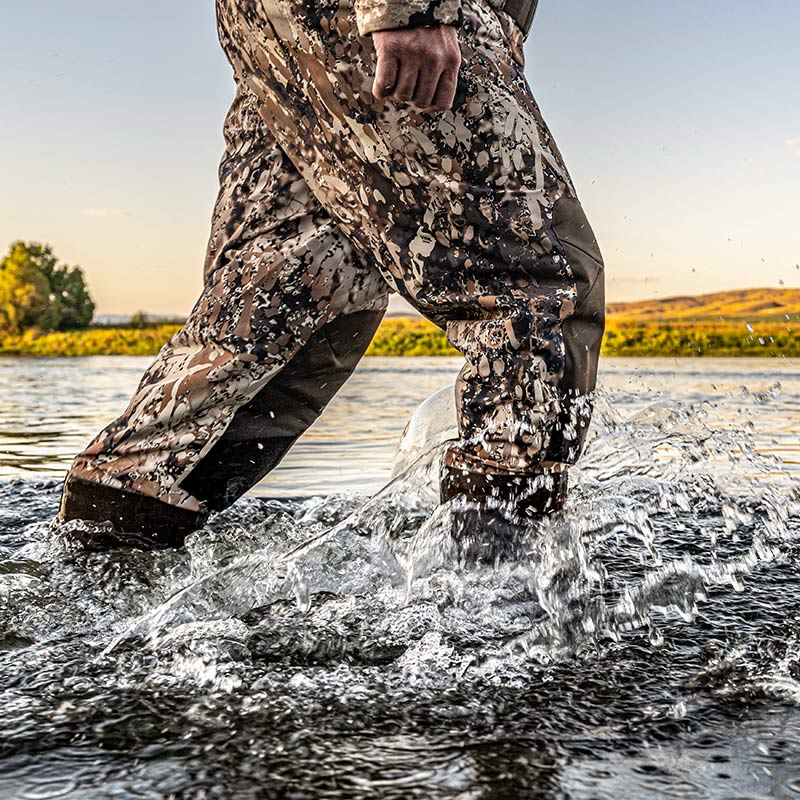 • Durable polyester camo fabric, reinforced knees, and slip-resistant rubber boots ensure long-lasting performance.