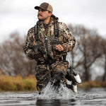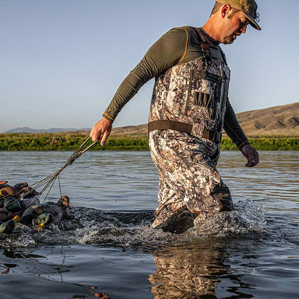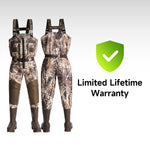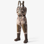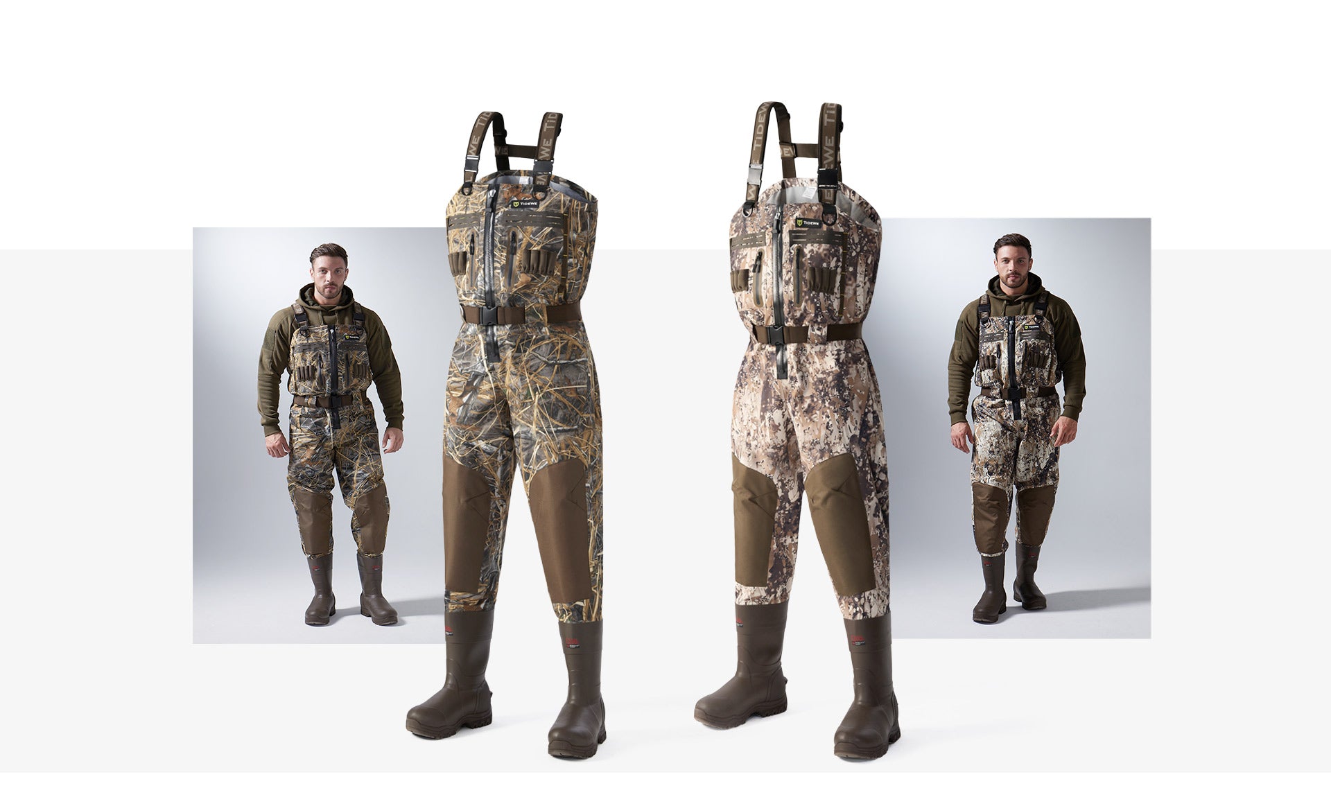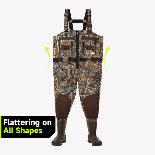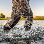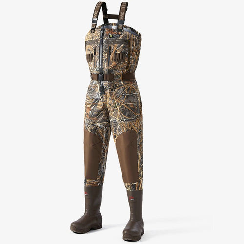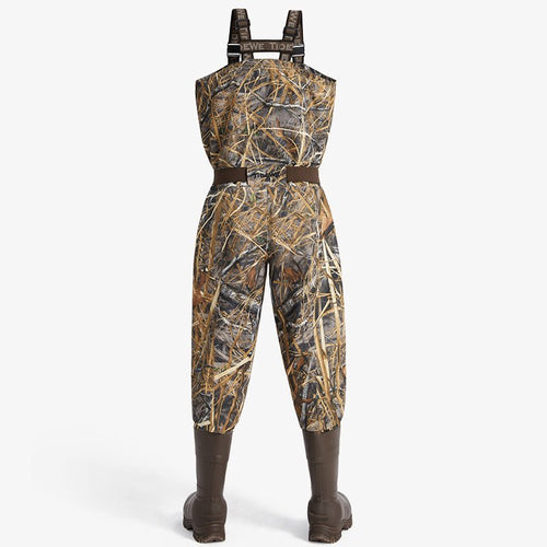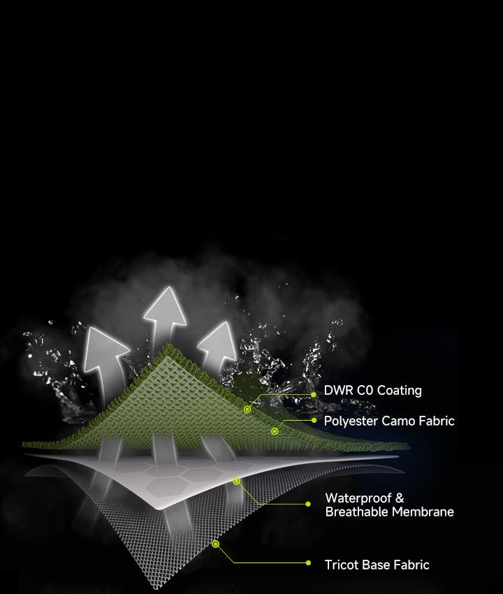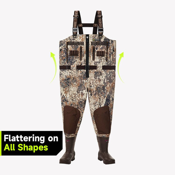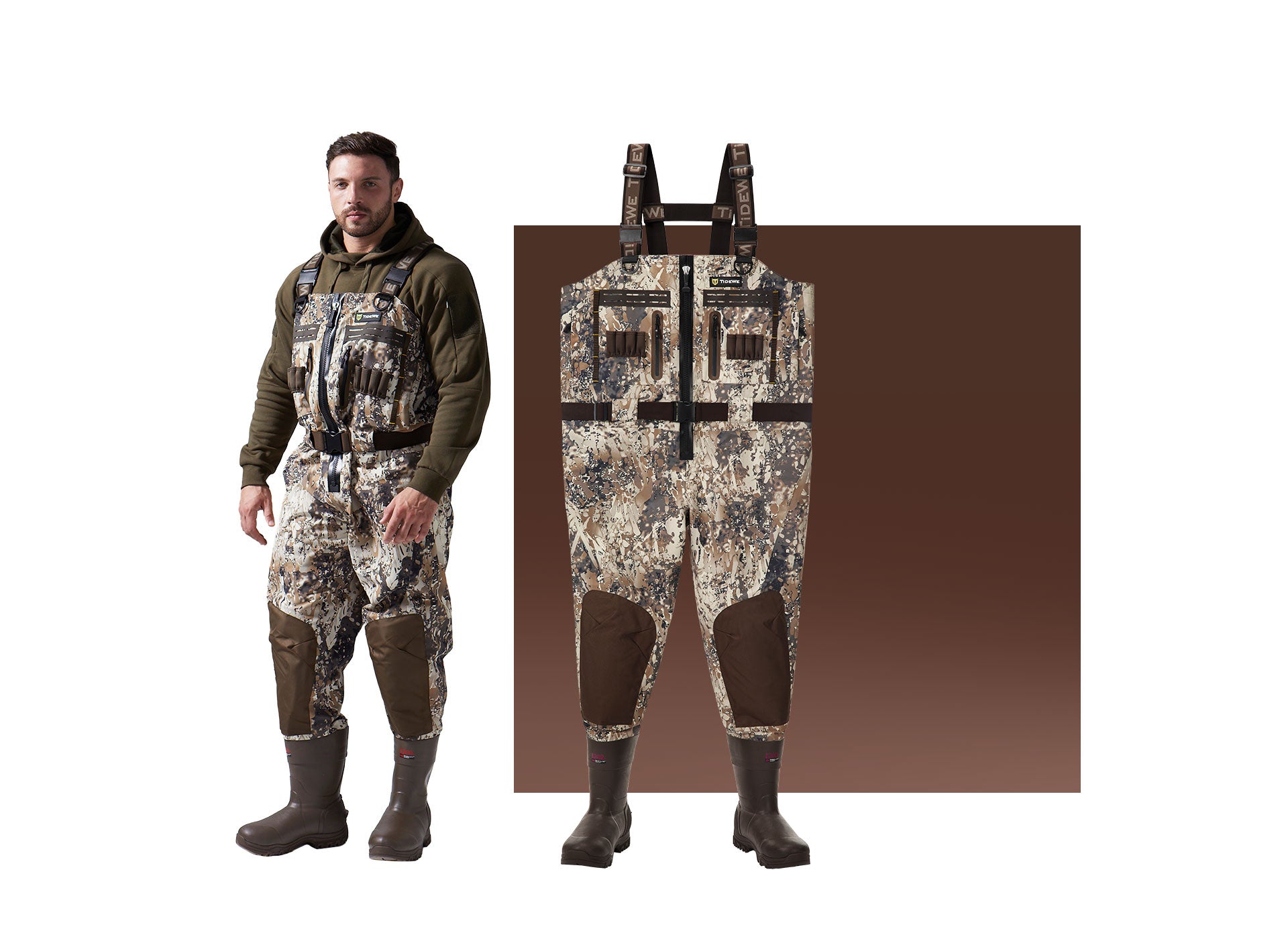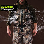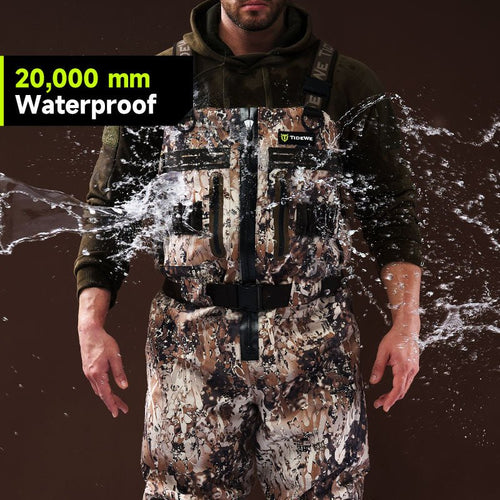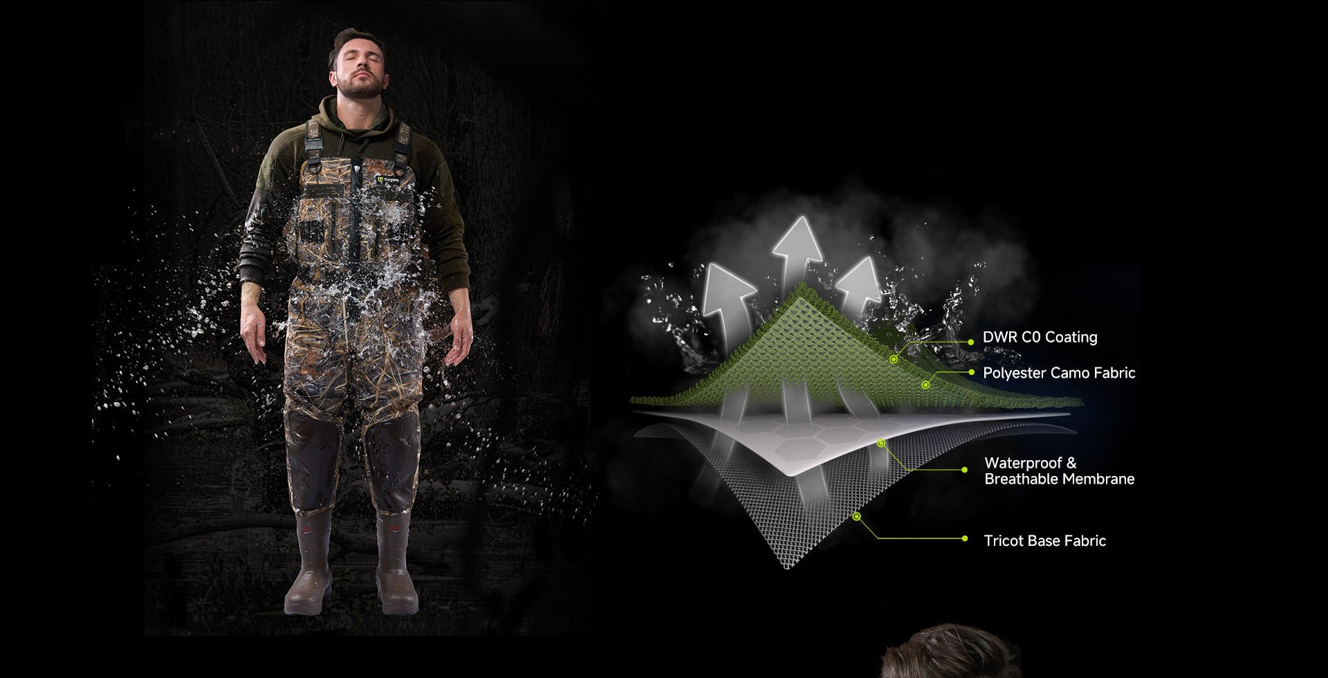 Waterproof-Breathable Polyester Fabric: With a 20,000mm waterproof rating, these waders are constructed from 4-layer waterproof-breathable polyester fabric, including a tricot base, waterproof breathable membrane, polyester camo fabric, and DWR C0 coating. This combination ensures durability, abrasion resistance, and exceptional comfort.
