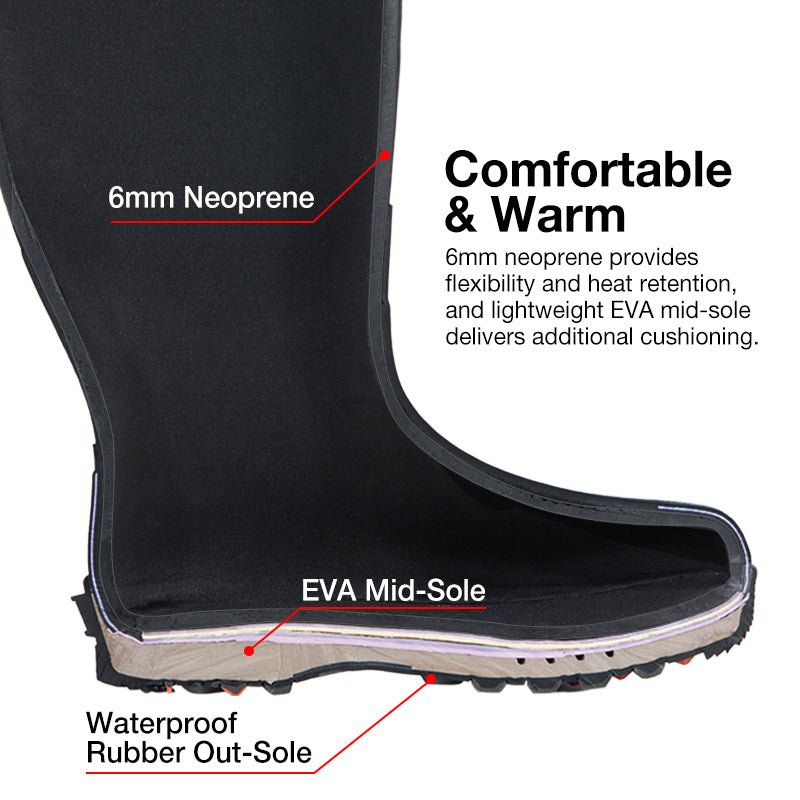 Waterproof Material: Made with 100% waterproof CR Flex-Foam, absorbs impacts, retains heat and flexes with your feet as you walk.