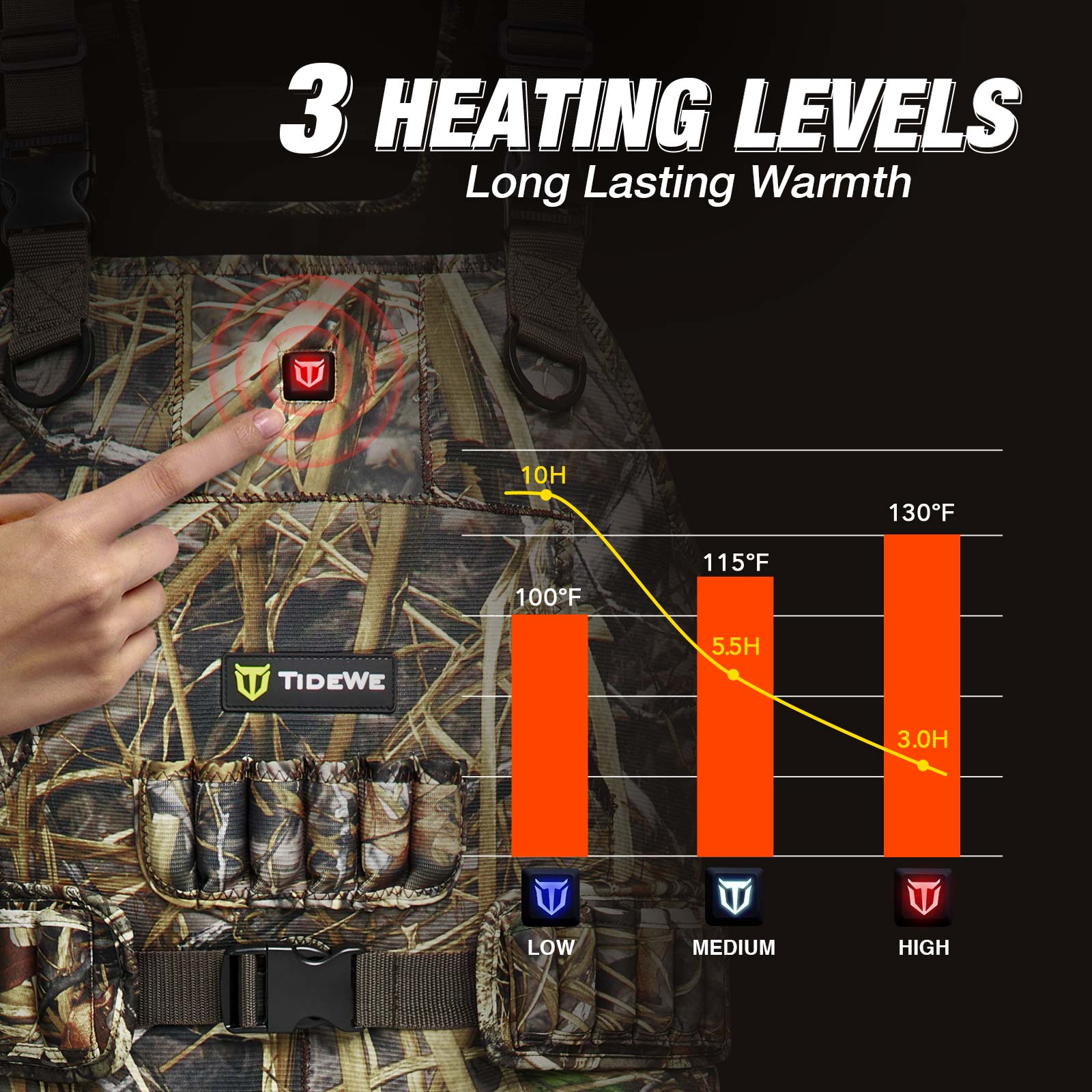 Smart Heating Design & Safety: TIDEWE heated waders feature 3 adjustable heat settings, which makes it easy for you to adjust the temperature according to your needs, delivering comfort in cold conditions. Waders can be fully charged in 3-4 hours; quick charge is only 2 hours. Up to 10 working hours on the lowest setting, 6 working hours on medium, 4 hours on high. Satety protection keeping you warm and safe at the same time.(battery not include)