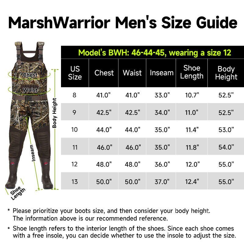MarshWarrior Chest Waders with Boots | Neoprene Bootfoot Waterproof Waders for Men, Women & Kids | Bottomland Camo Hunting Bibs for Waterfowl Hunting