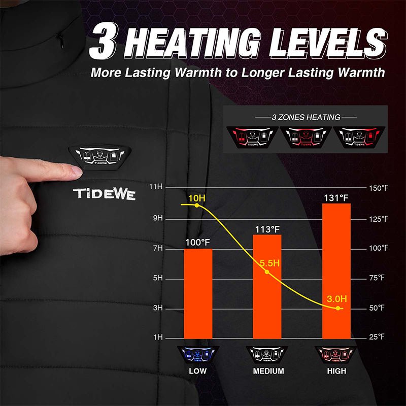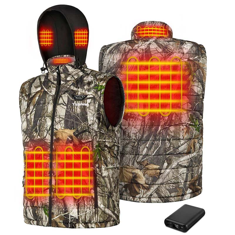 Keep Your Body Warm: TIDEWE'S heated vest with retractable heated hood will keep you warm in all outdoor activities like hunting, skiing, camping, and ice fishing! With 6 Carbon fiber heating zones, which are distributed across the collar, mid-back, both sides of the abdomen, as well as both sides of the ears for core-body warmth, it's impossible to get cold!
