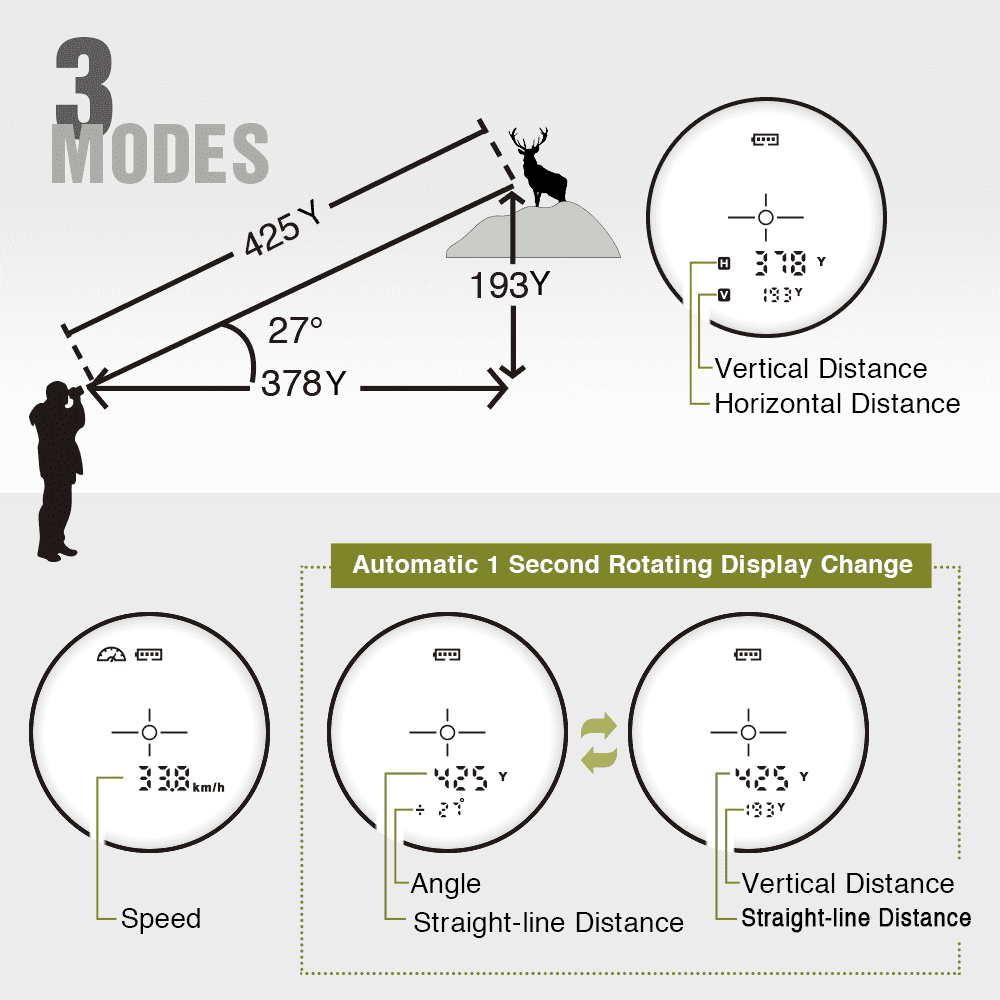 EASY TO USE: You simply point the target, push a button, and you get almost instantaneous precision range data on an easy-to-read LCD display. Short press MODE button to select different mode. Long press Power button to scan the distance. You can Adjust the sight according to “+” and “-”on the adjust focus knob. Long press "MODE" button to switch “Meter” and “Yards”.